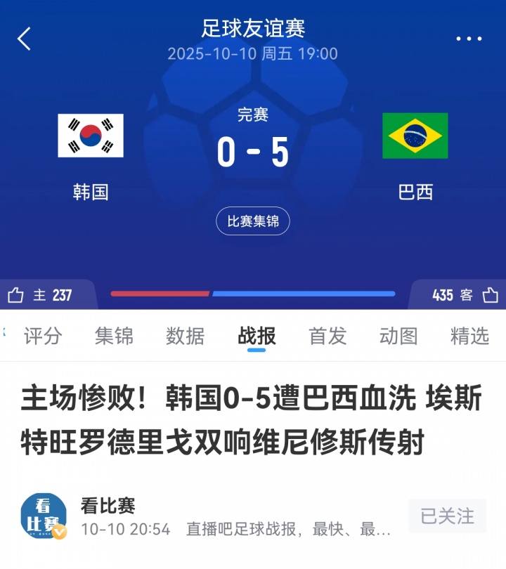 Bốn ngày trước tại Hàn Quốc, đội Brazil đã đánh bại đội Hàn Quốc với tỷ số 5-0.